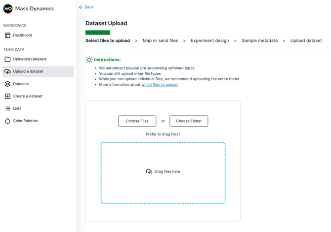 Once you have identified snd prepared the required files, follow the steps below to upload your data on Mass Dynamics.