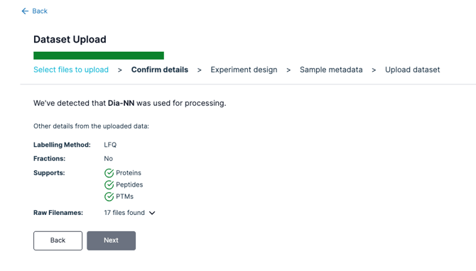 The upload experience automatically recognizes pre-processed data from popular processing software, including MaxQuant , Spectronaut, DIA-NN and Bruker ProteoScape (TIMS-DIA-NN). You can learn more about what files to upload here.