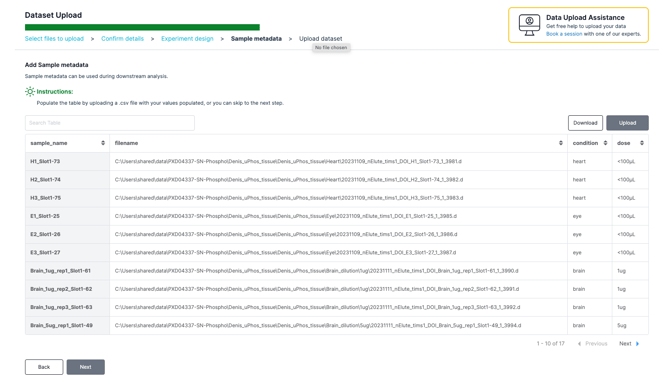 - You can then directly populate or upload Sample Metadata to include extra information useful for downstream analyses