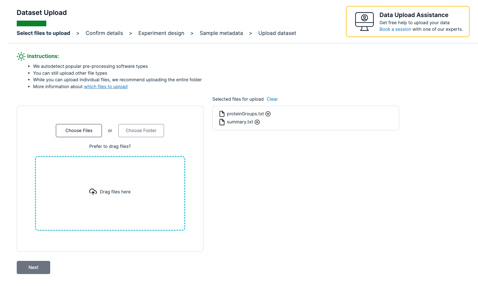 To analyze dataset pre-processed with MaxQuant, go to the Dataset Upload page (see screenshot below), upload the following files and follow the upload instructions: